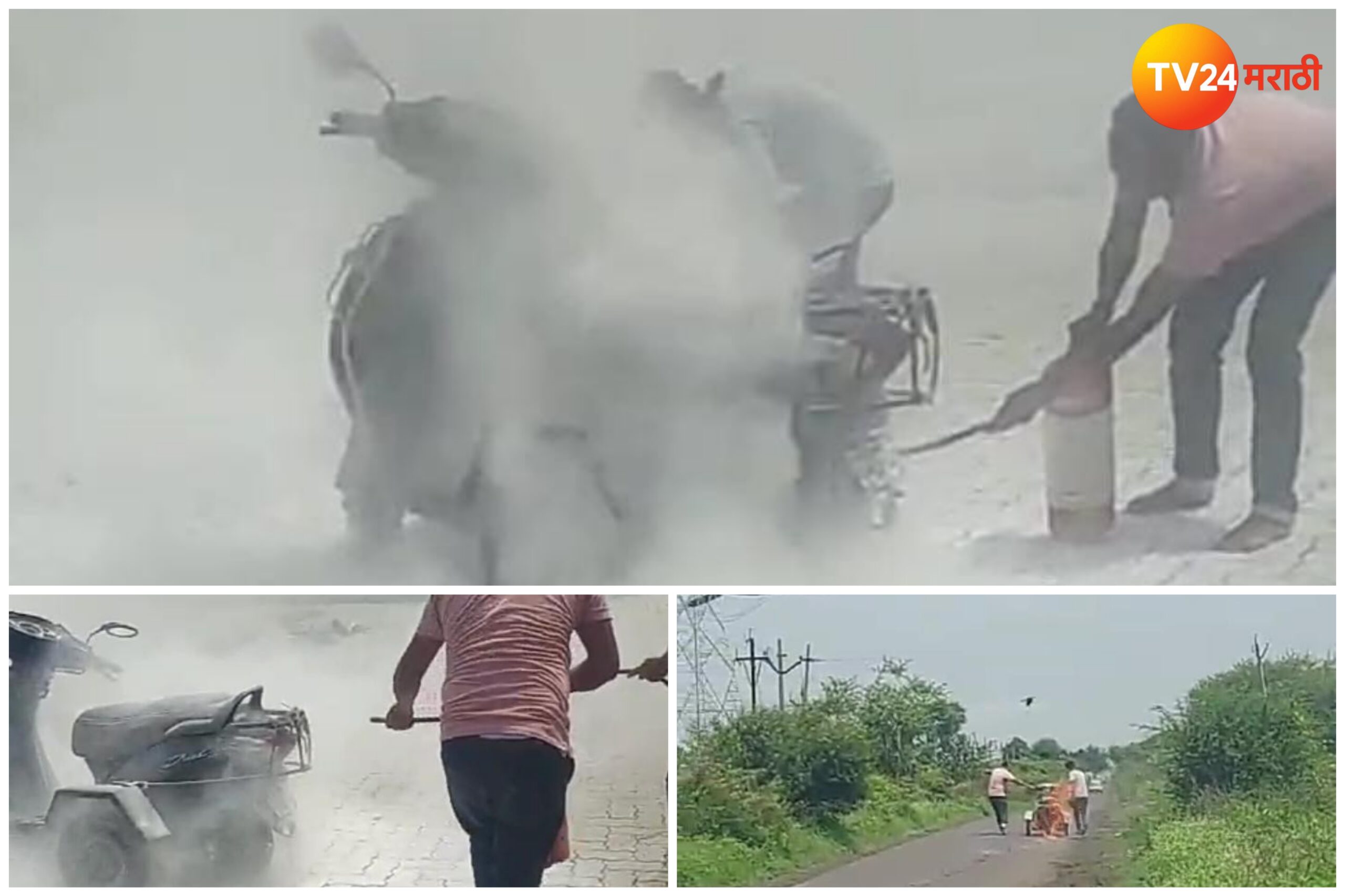 केलसुला येथील अपंग शेतकरी एकनाथ गिऱ्हे यांची ही स्कुटी होती गाडीच्या इंजिन मध्ये आग लागली त्यामुळे पेट्रोल पंप मॅनेजर नामदेव नागुलकर यांनी एकनाथ गिऱ्हे यांना गाडीच्या खाली उतरवून आग विझवण्याचा प्रयत्न केला पेट्रोल पंपावरील संपूर्ण स्टाफ यावेळी गाडीची आग विझवण्यासाठी समोर आला काहींनी फायर टेंडरने आग आटोक्यात आणण्याचा प्रयत्न केला तर काहींनी बाटलीमध्ये असलेल्या वाळू ने आगेवार नियंत्रण नियंत्रण मिळवण्याचा प्रयत्न केला मात्र आग आटोक्यात येत नव्हती त्यामुळे नागुलकर यांनी पेटत्या कुटीला धरून पेट्रोल पंपाच्या बाहेर नेले नागुलकर यांच्या या कार्यामुळे मोठा अनर्थ टळला आहे
