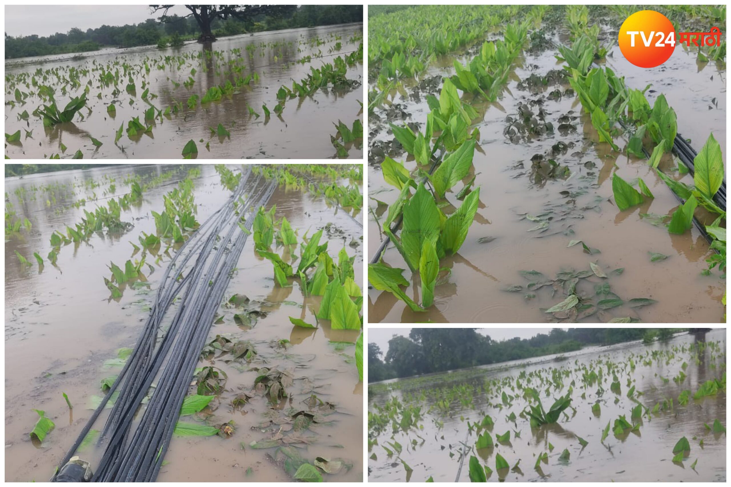 हिंगोली जिल्ह्यातील सेनगाव तालुक्यातील कहाकर बुद्रुक,ताकतोडा,वाघजाळी,आजे गाव, हाताळा, यासह परिसरातील अनेक गावात ढगफुली सदृश्य पाऊस झाला आहे त्यामुळे गावाला गत असलेल्या ओढ्याला पूर आल्याने पुराचे पाणी शेतात घुसल्यामुळे शेती पिकांचे मोठ्या प्रमाणात नुकसान झाले आहे कहाकर बुद्रुक येथील संजय भोळे यांच्या शेतातील सुमारे तीन एकर मधील हळद पीक पूर्णपणे पाण्याखाली होते यांच्यासह यांच्या गावातील अनेक शेतकऱ्यांचे सुमारे 40 ते 50 हेक्टर वरील नदीकाठच्या शेतकऱ्याचे नुकसान झाले आहे अशी माहिती का कर बुद्रुक येथील संजय भोणे यांनी दिली आहे