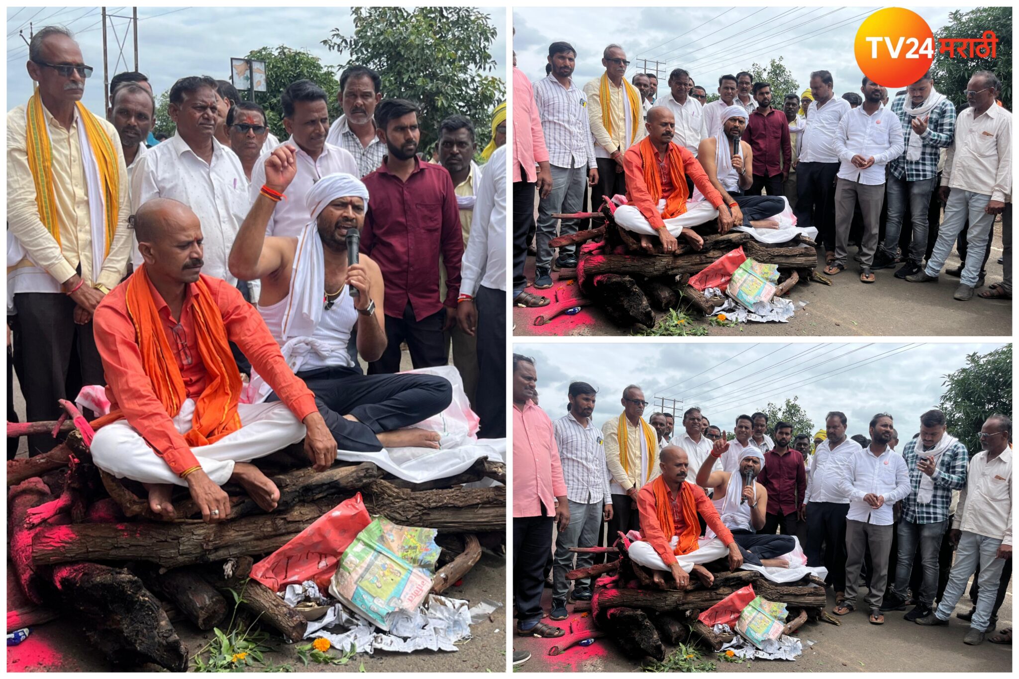 हिंगोलीतील अतिवृष्टी ग्रस्त शेतकऱ्यांनी गोरेगाव जिंतूर महामार्गावर स्वतःचे सरण रचून केले अनोखे आंदोलन