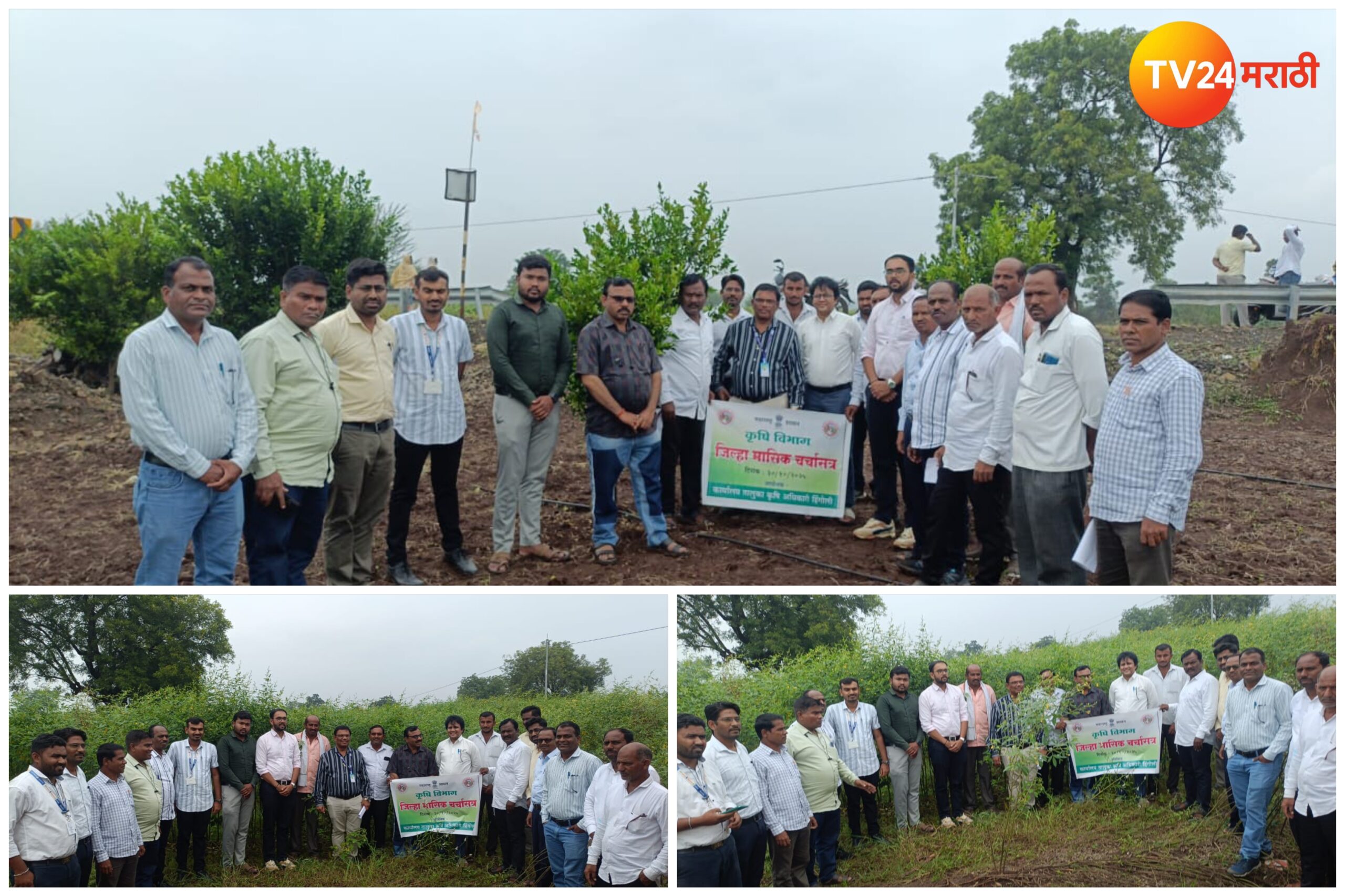 कनेरगाव नाका:– महाराष्ट्र शासनाने प्रत्येक गावातील शेतामध्ये प्रत्येक महिन्याला कृषी विभागातर्फे घेण्यात येत असलेल्या जिल्हा मासिक चर्चासत्रानुसार आज दिनांक 30 ऑक्टोंबर 2025 रोज गुरुवारला हिंगोली तालुक्यातील मोप येथील त्रंबक भानुदास धाबे व मधुकर रामजी भोसले यांच्या शेतात जाऊन मासिक चर्चासत्र कार्यक्रम आयोजित करण्यात आला होता. त्यामध्ये पिकांवरील रोग, शेताची रोगप्रतिकारक शक्ती कशी वाढवायची, फवारणी कशाप्रकारे करायची, पिकांची काळजी कशी घ्यायची, उपाययोजना काय करायच्या, याबद्दल शेतकऱ्यांना माहिती देण्यात आली. या चर्चा सत्राला हिंगोली जिल्ह्यातील प्रसन्न हजारे कृषी संचालक हिंगोली, डॉ. गजानन गडदे शास्त्रज्ञ, शिव संदीप रणखांब तालुका कृषी अधिकारी, गणेश पवार मंडळ अधिकारी, संग्राम जाधव जिल्हा कृषी अधिकारी, उल्हास राठोड उप कृषी अधिकारी ,कमलाकर सांगळे मंडळ अधिकारी, तसेच कळमनुरी, नरसी नामदेव, वसमत, सेनगाव, औंढा नागनाथ, हिंगोली, कनेरगाव नाका येथील सर्व जिल्हा व तालुका कृषी अधिकारी व मंडळ अधिकारी उपस्थित होते. तसेच सहाय्यक कृषी अधिकारी उत्तम साठे ,विनय शिंदे, माधव गोरे, विजय पवार, देवानंद उंदरे , प्रशांत व्यवहारे , पिरालालजी राठोड, गणेश दहात्रे उपसरपंच ,बालाजी भोसले, रामेश्वर बर्वे, सखाराम मुधोळकर, चंद्रशेखर भोसले, विलास पानपटे ,संतोष बर्वे, आदी करून शेतकरी उपस्थित होते. या कार्यक्रमाला योग्यरित्या पार पाडण्यासाठी गजानन पतंगे व गणेश दहात्रे यांनी मेहनत घेतली.